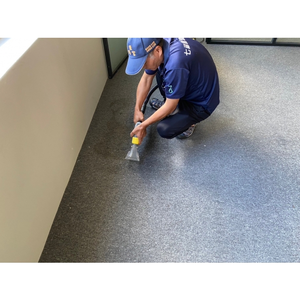 七福環工專業地毯清洗,先使用乾式吸塵去除灰塵,人工巡視去除釘書針等異物,最後使用專業地毯清洗機將地毯徹底洗淨。